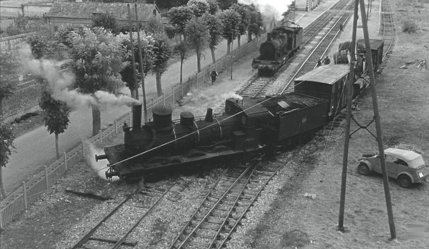 Despite this act of sabotage which damages the locomotive, the engine is repaired overnight. The Resistance presses on. When the train departs for Germany, they resort to subterfuge: Alleging that they have to take an alternate route because of air raid damage, they throw switches that route the train on a loop that leads it back to its origin; at each station they pass, the signs that identify it are changed to those the train is supposed to pass on its way into Germany. This gains them another day. When the Allied army still hasn’t caught up with them, they conspire to cause train wrecks on the tracks, derail the train by loosening the spikes that hold the rails to the railbed, and other actions.