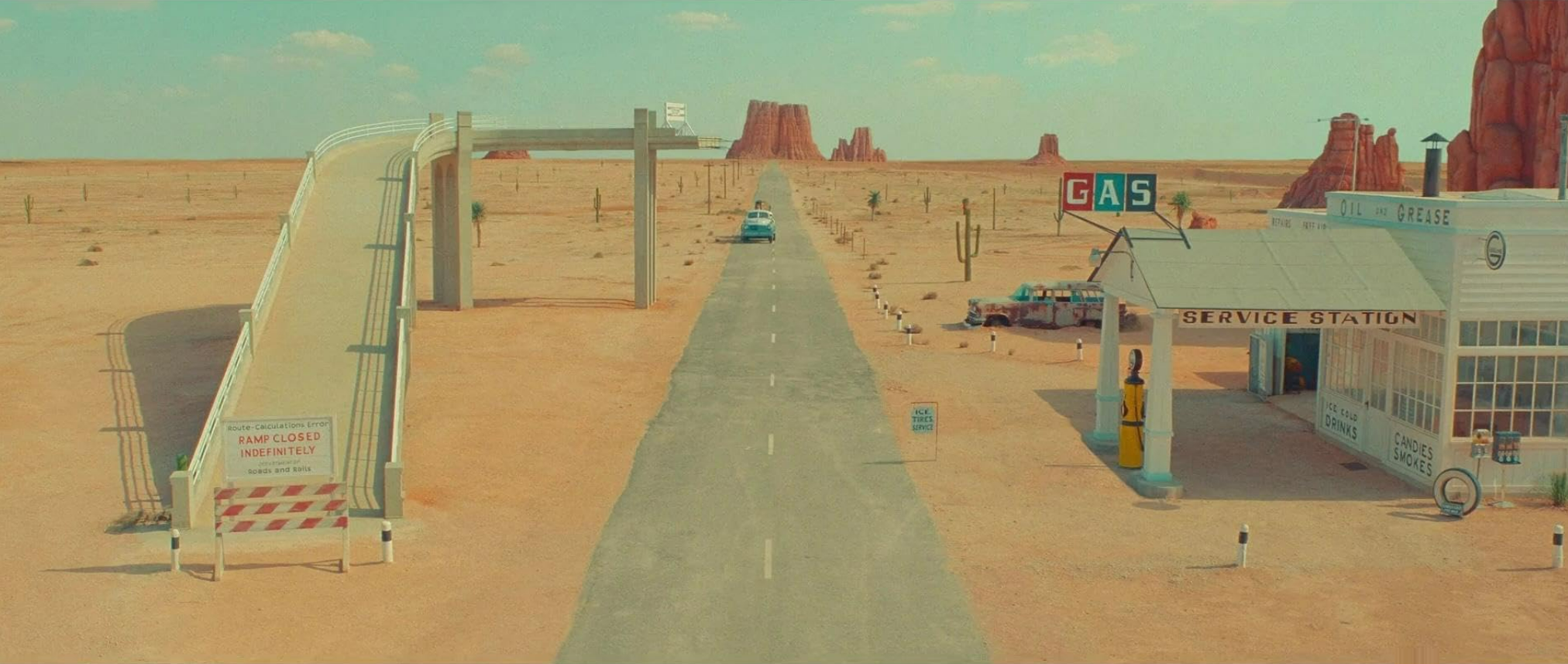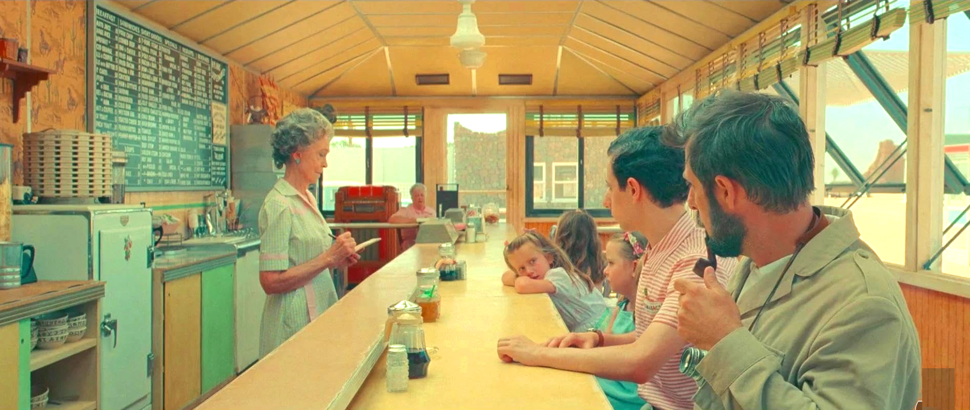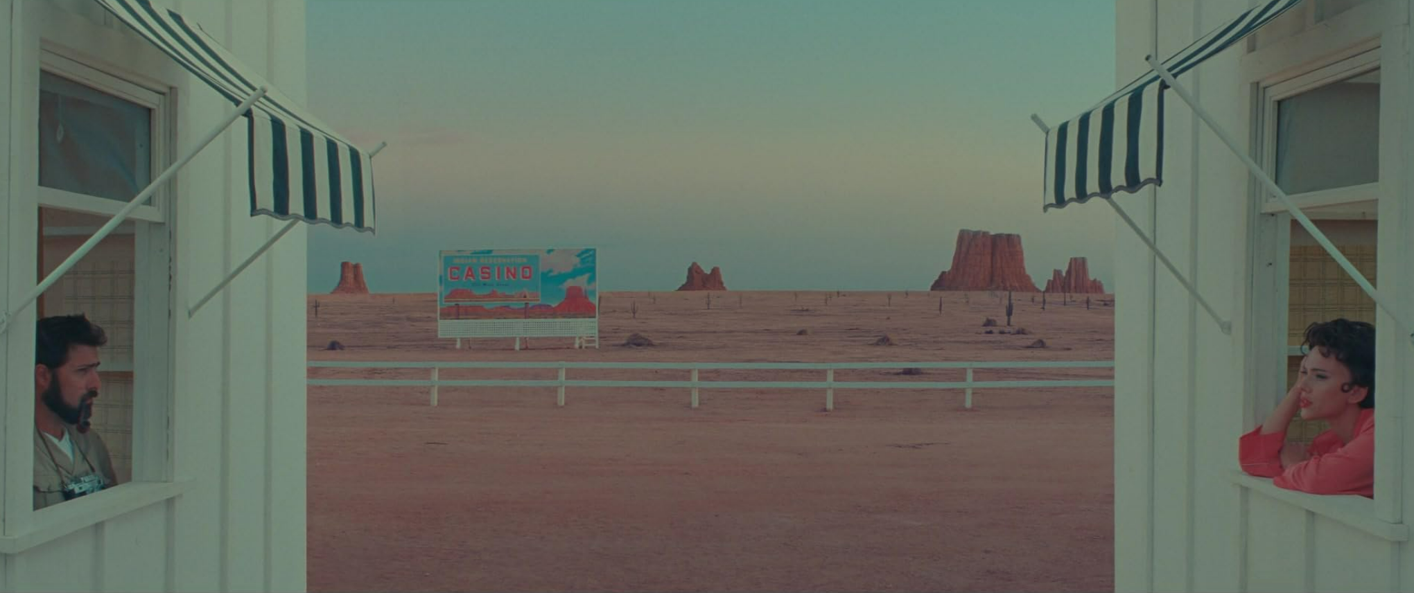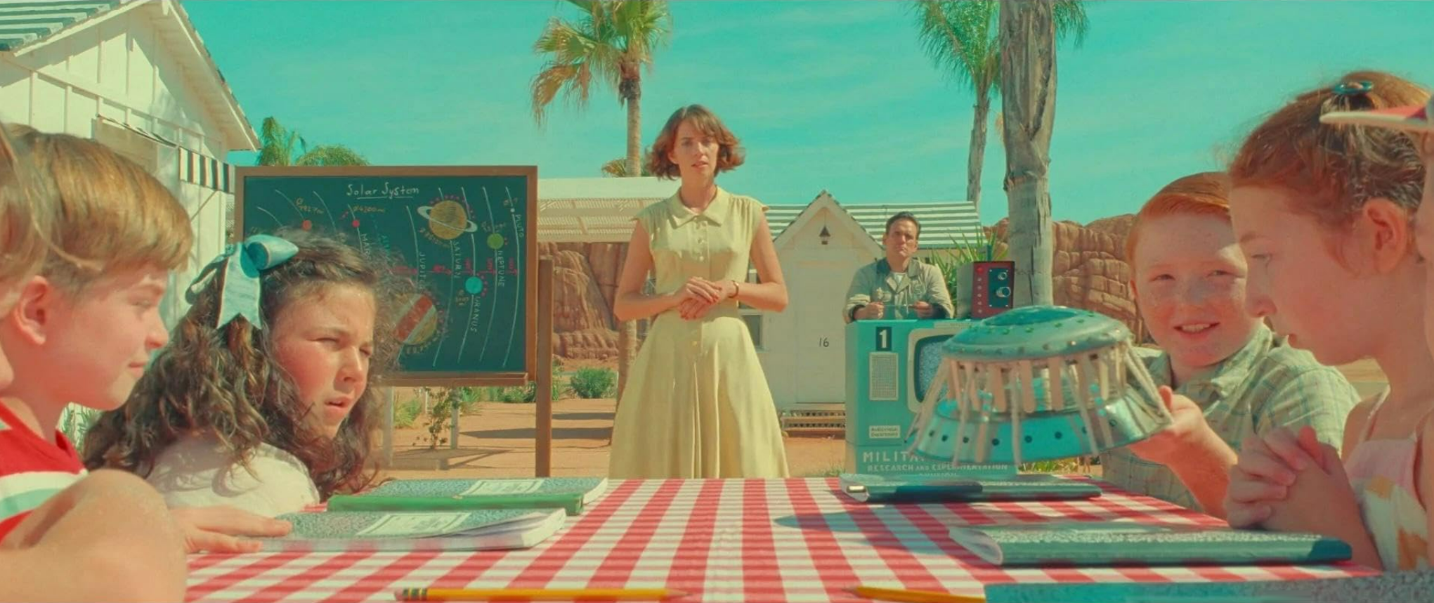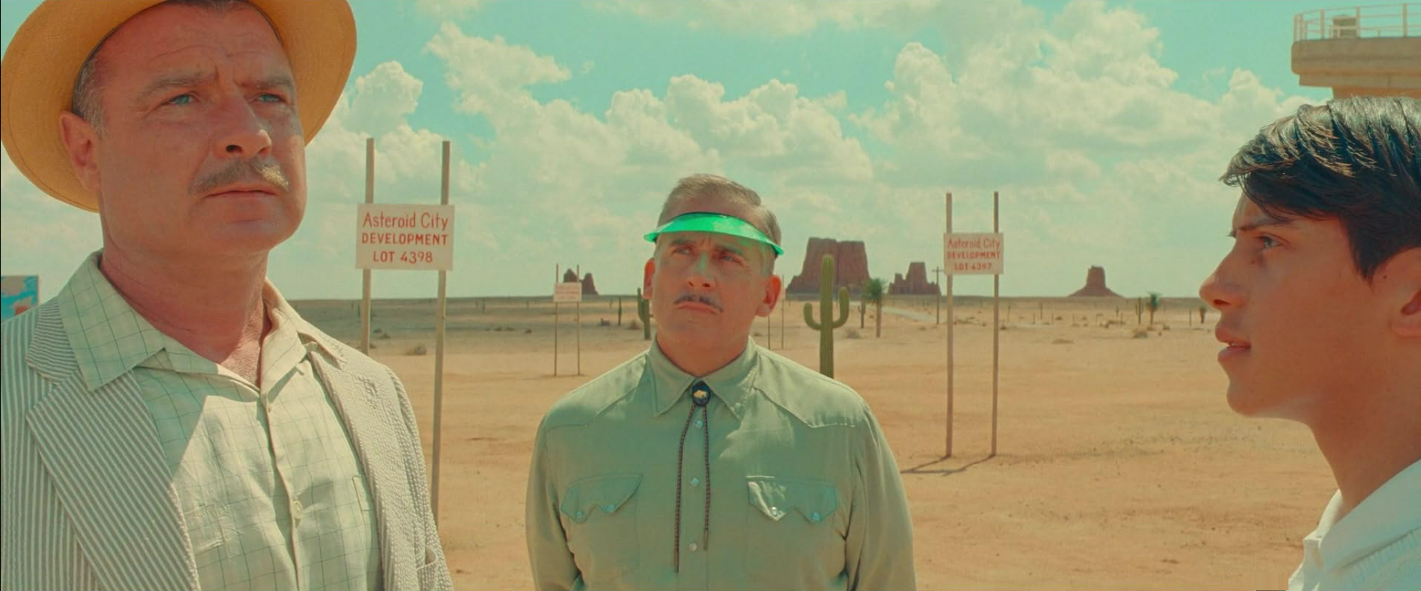 To this somewhat promising setup, the writer and director Wes Anderson has provided not one, but two frames. The first to be established is that we, the movie audience, are really watching a television presentation. The TV show concerns not the story of the people in the desert but the origins of a stage play -- that's the second frame. The contents of the play are the events in the desert setting, featuring the characters described above. Got that? Three layered realities: the TV ur-frame; the play that is the subject of the TV show; and the contents of the play, which are set in the desert.