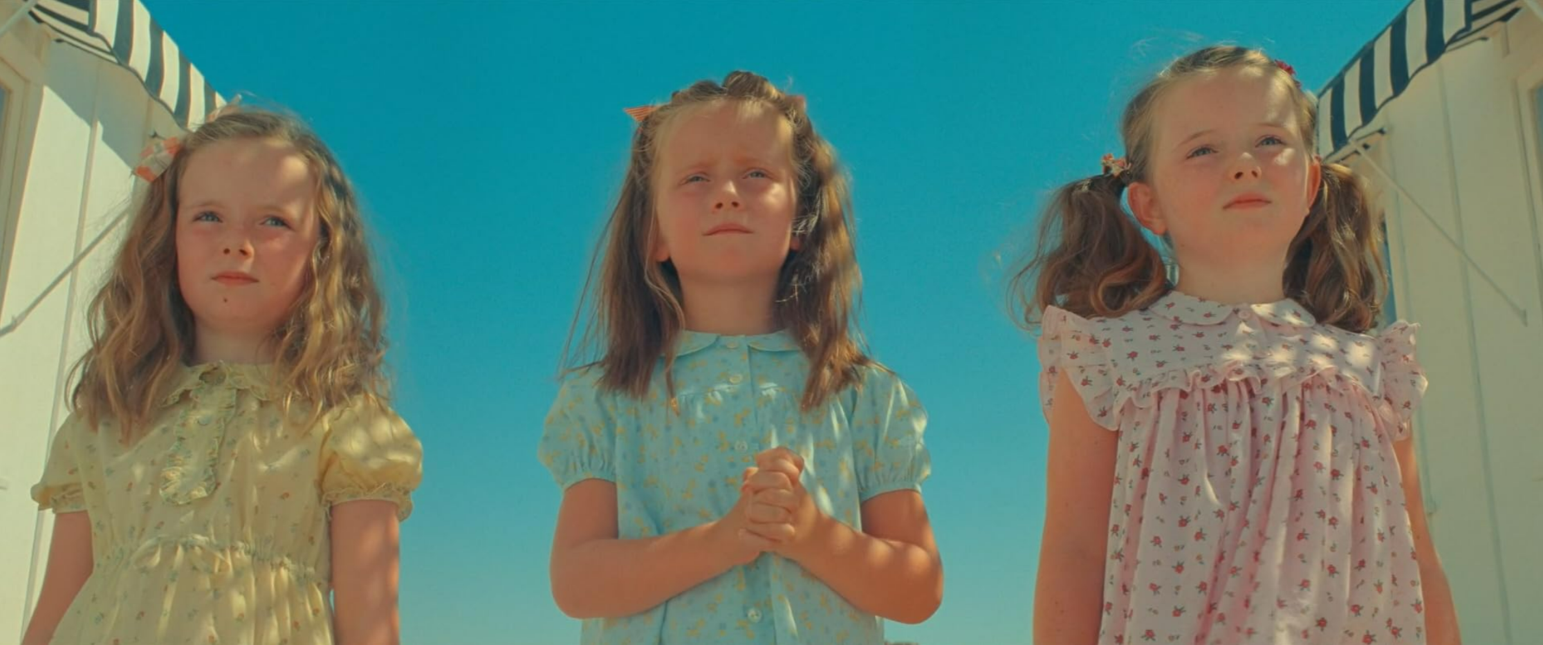 Anderson's films have been growing more and more angular, and symmetry in the frame is his signature. But in this movie, it gets totally out of hand. He not only makes a virtue of symmetry but uses props and set elements to underscore the compositions. Look at these children in the image below, cunningly arranged in the center of the frame, while identical structures loom on either side of their grouping. To emphasize the angular schema, the sequence that introduces the film’s primary setting sets the camera down in the center of town and then pans and tracks in a mechanized, almost robotic manner. This business stops being cute very early in the movie, but it continues with a life of its own.