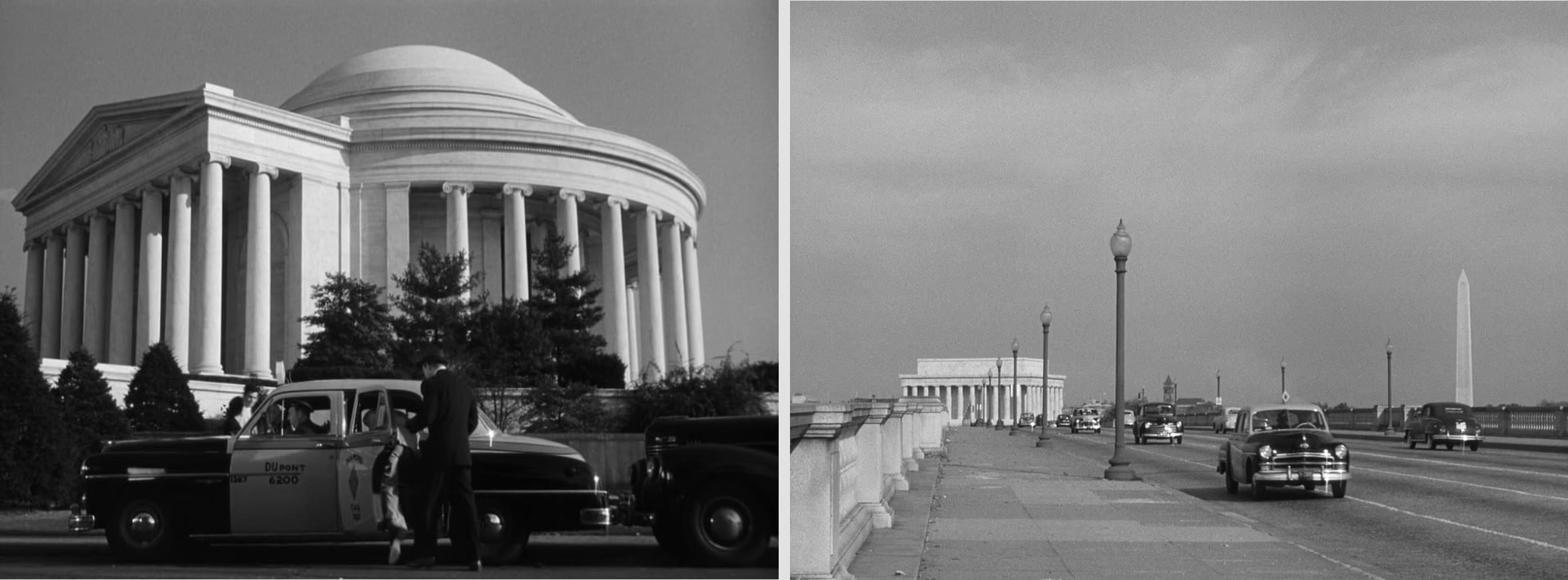 Enough about Highsmith. This is a piece about the Hitchcock movie, after all, and there’s plenty to praise: The spooky, extremely effective night lighting. The characteristic Hitchcockian shots of American monuments (in this film, the Jefferson, Lincoln, and Washington Memorials; in “North by Northwest,” visages of the same presidents appear on Mount Rushmore); the single shot which makes use of distortion (here, Miriam’s murder reflected in her eyeglasses; stairways in “Vertigo” or the shower drain in “Psycho”); the comic shot of a tennis crowd turning their heads back and forth in unison to watch a match.