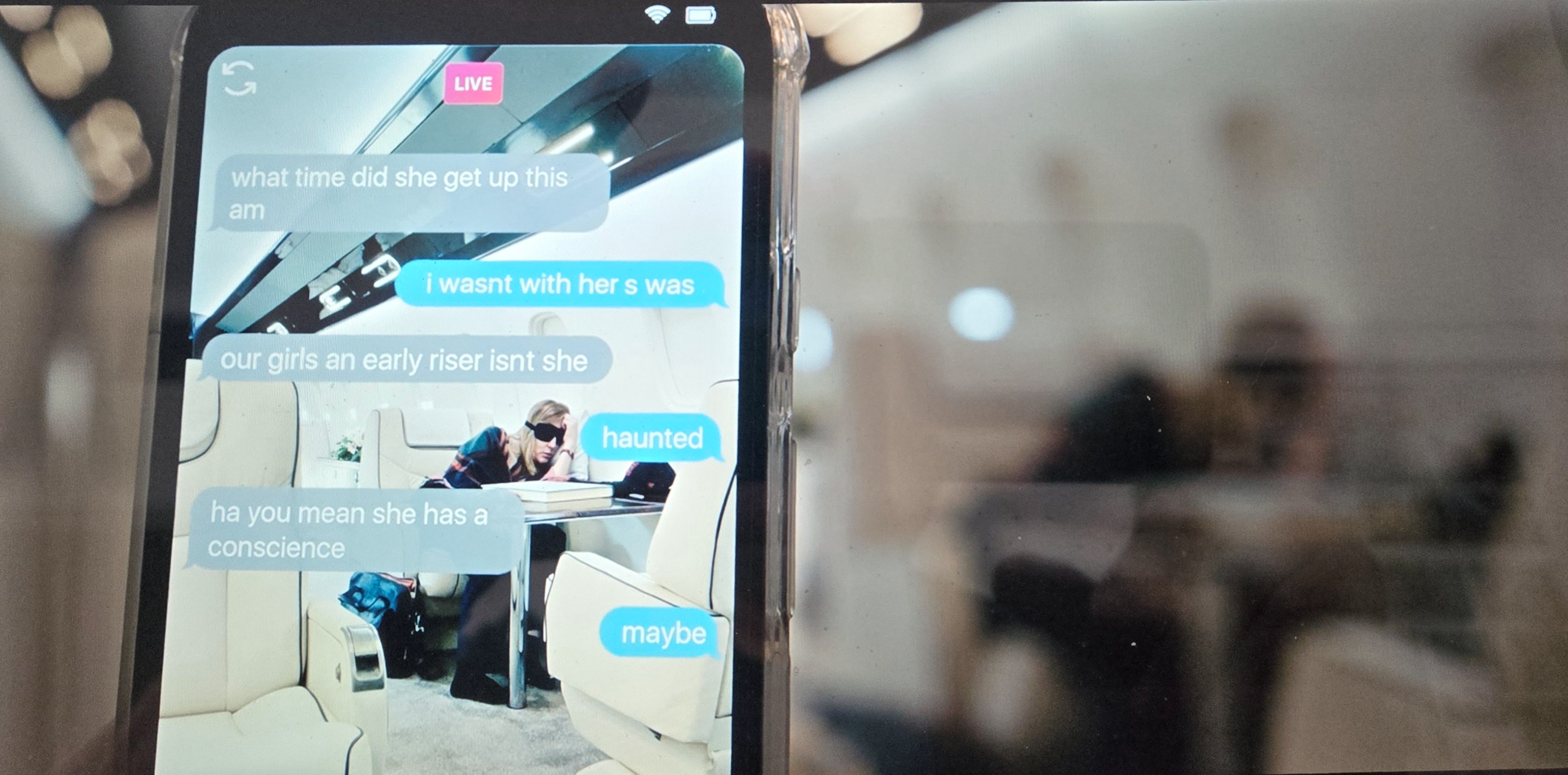 For example, the first image in the movie shows a mobile phone, the screen of which shows a slumped, disheveled, sleep-masked Tár (Cate Blanchett); beyond the phone, out of focus, is the same scene, indicating that the image is fresh. Superimposed on the image is a mocking text exchange between the phone’s owner and an unknown party.