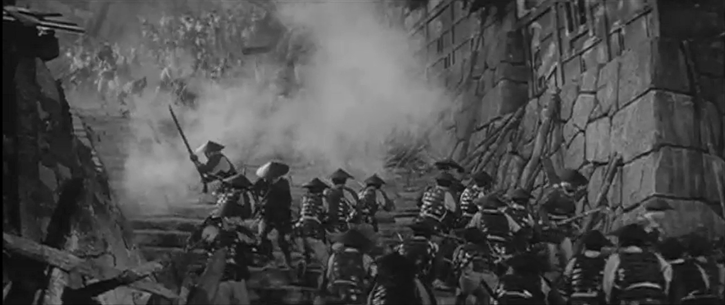 In this film set during the warring clans period of Japanese history, when feudal warlords fought each other for territory and influence, the Yamana clan has just defeated the forces of Akizuki. The first half hour of the film belongs to two peasants, Tahei and Matashichi, who have gone to the war not to take sides but to rob dead soldiers on the battlefield and sell the booty. But they are swept up by the winning army, which assumes they were on the losing side, and together with hundreds of other prisoners are put to work digging through the ruins of the burned-out Akizuki castle. Next, having gotten away from there, the two find themselves in thrall to a mysterious samurai, Rokurota Makabe (Tohiro Mifune). He, along with two elderly retainers and a beautiful young princess (Misa Uehara), comprises all that is left of the defeated Akizuki clan. Together, they must disguise themselves as peasants and cross enemy territory to reach the safety of a neutral territory which has offered them asylum as long as they bring their gold with them.