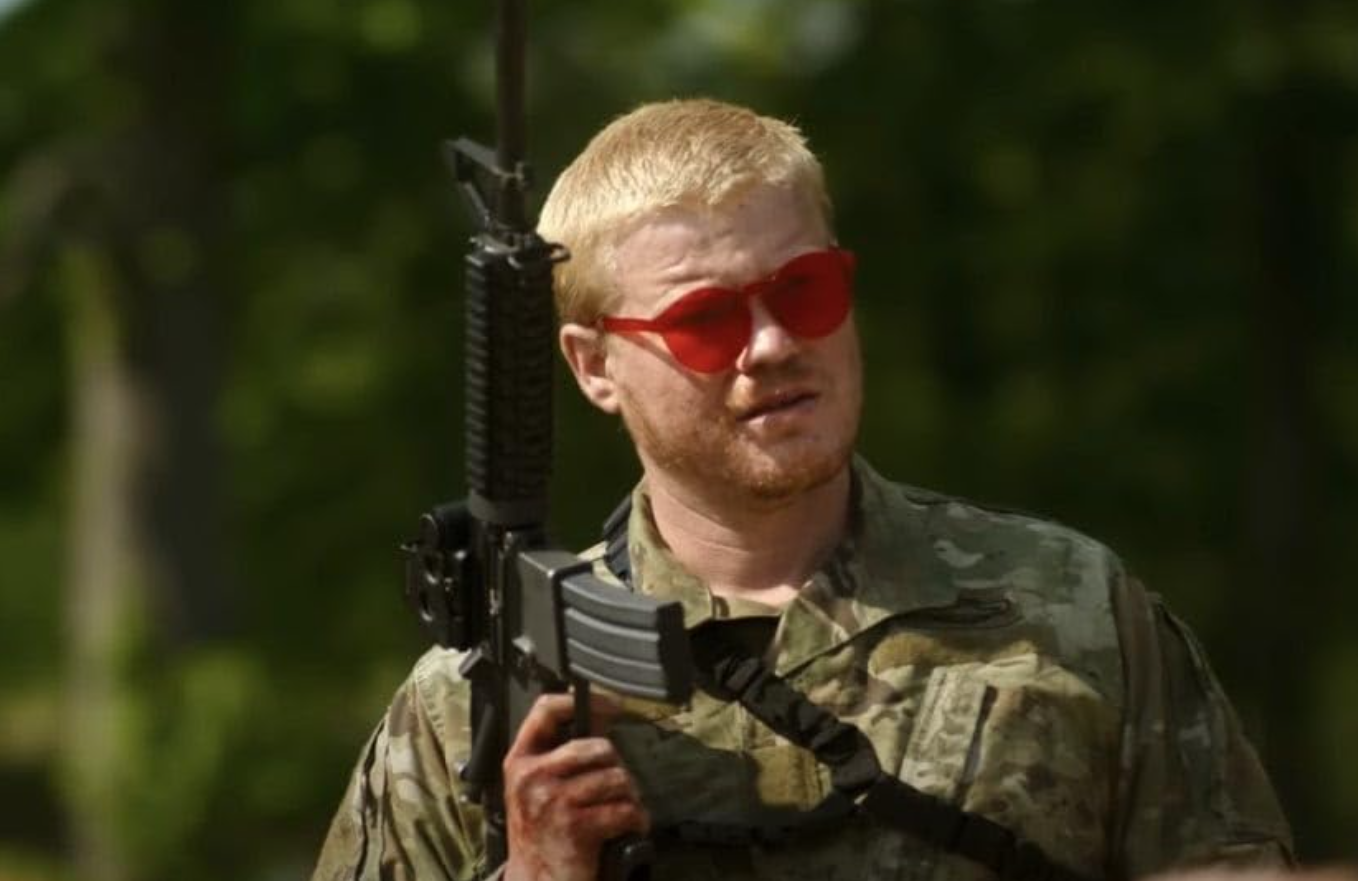 Centrally, there’s the incident seen in the movie’s trailer, where some camo-clad men waylay the group and interrogate them as to “What kind of Americans are you?” There seems to be no right answer to the question, which is never resolved; these armed men never identify themselves either. The smirking redheaded militiaman is played by the actor Jessie Plemons – he also stood out in a supporting role in “Killers of the Flower Moon” -- and though his character doesn’t have a name and only appears in this one scene, his is the most powerful performance in the film.
