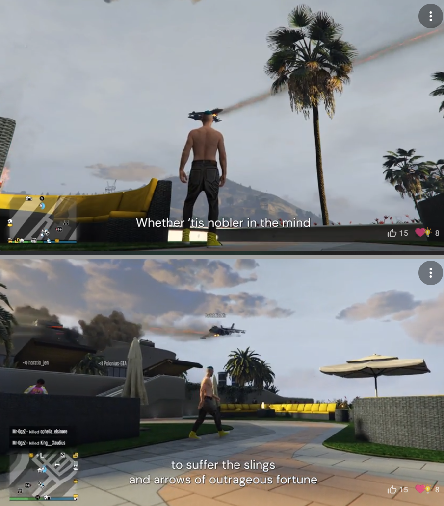 While playing the game they come across an enormous outdoor amphitheater — in fact, a facsimile of the Hollywood Bowl. They climb onto the stage and one of them tosses off a speech from Shakespeare, like you do if you’re an actor. Then they have a brilliant idea: It’s pandemic lockdown and no one can see each other, or get together and rehearse; there can be no audience. And yet they can see each other inside the game — even if represented as some kind of avatar (which could be any age or shape or sex, could have an alien body for that matter). From there, it’s a short leap to realizing that in this way they could stage theater. And since they’re in Grand Theft Auto, where everyone is killing or being murdered all the time, why not “Hamlet,” in which, famously, pretty much everybody dies?