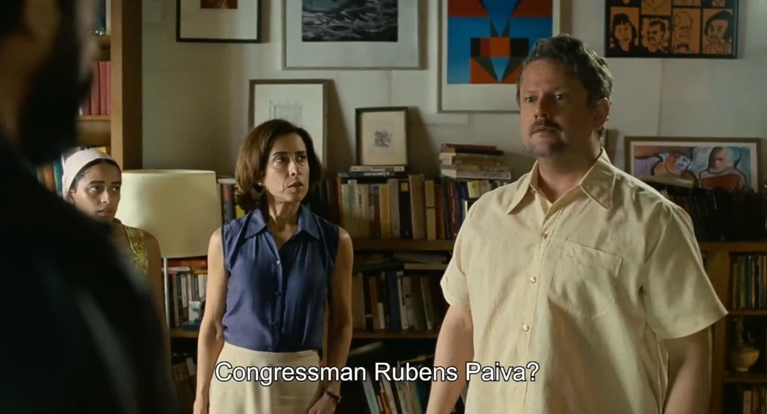 The film’s most intense moments show the arrest, the occupation of the family’s house by the sinister plainclothes men, and the arrest and interrogation of Eunice. She spends ten days being shuttled between a dank cell and an interrogation room where she is asked the same questions day after day. After her release she looks for answers about her husband’s fate, and gets none. Finally, they move from Rio de Janeiro to another city, and the next scene is set decades later when she gets official notice of her husband’s death.