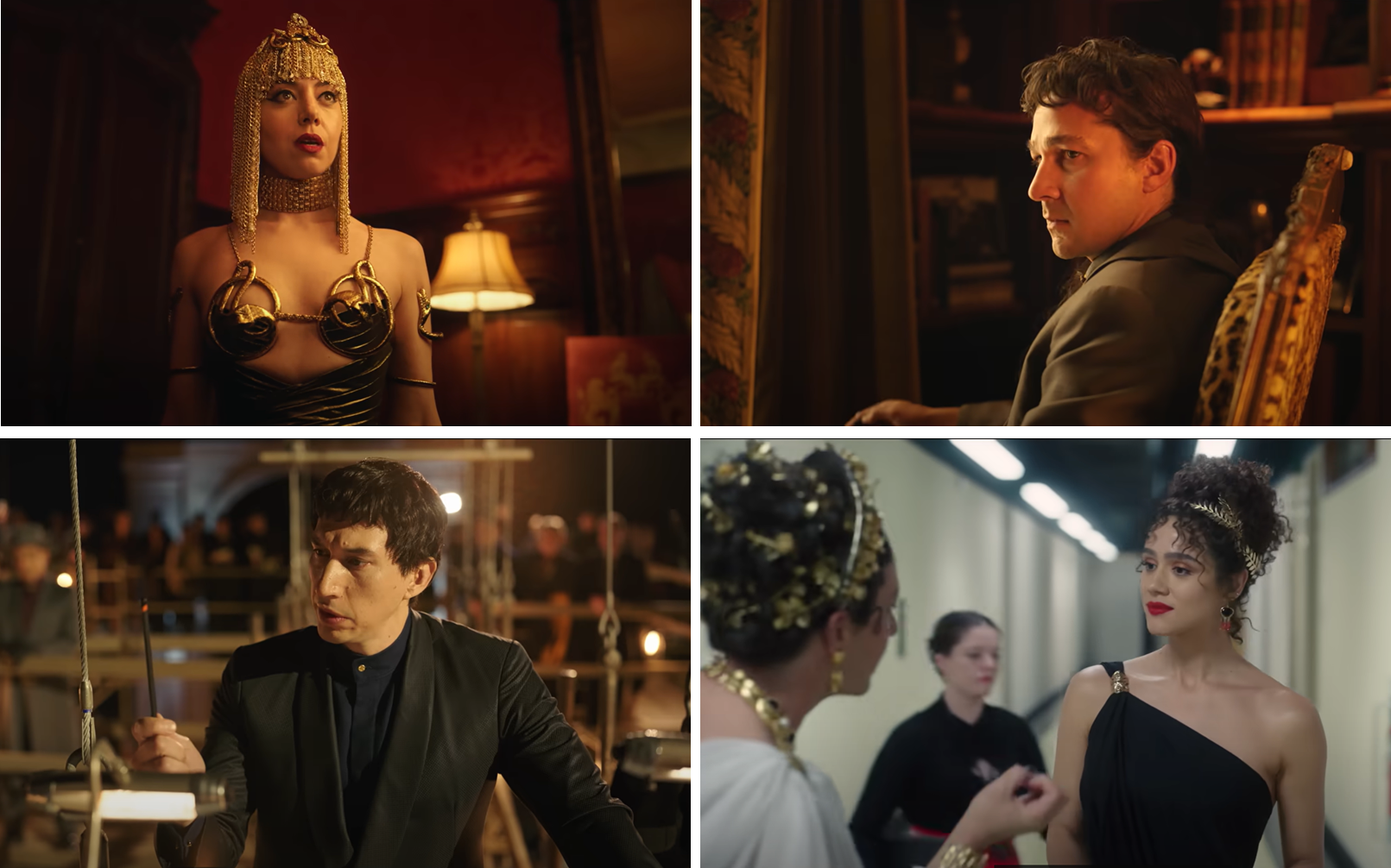 I tried above to describe what “Megalopolis” was about, but let me try harder. In an alternate timeline, NYC is called New Rome, and while it’s falling apart, the rich delight themselves with elaborate parties, banquets, and literal circuses. In fact, the way the film treats these spectacles is a good example of how the film balances its modern-day reality — more magical realism than reality — with its homages to imperial Rome. The vast entertainment held in Madison Square Garden features trapeze artists and clowns, as well as a chariot race and sword-fighting gladiators. And yes, the male characters wear Ceasar haircuts and occasionally togas, and have Latin/Roman names like Claudius, Cicero, and Crassus, while the women also wear tunics and long toga-like dress, their hair arranged in chignons. These references to imperial Rome, or at least the clichéd image of ancient Rome in the modern mind, infuse the entire movie.