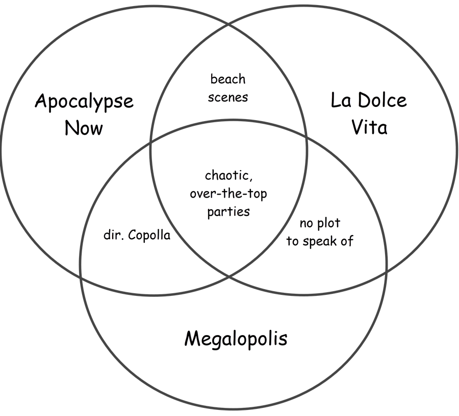 So we have all this spectacle, these characters, and a sort of incipient plot. Is that enough? It was enough for “La Dolce Vita,” which “Megalopolis” resembles in parts. In 1960 these elements were enough for English-language reviewers to judge “La Dolce Vita” — if you believe the trailer4 — as a “masterpiece” and “the greatest movie ever made.” I don’t see why Coppola’s film can’t be accorded the same reverence. I saw the Fellini film as an undergrad and was totally lost; I enjoyed “Megalopolis” much more.