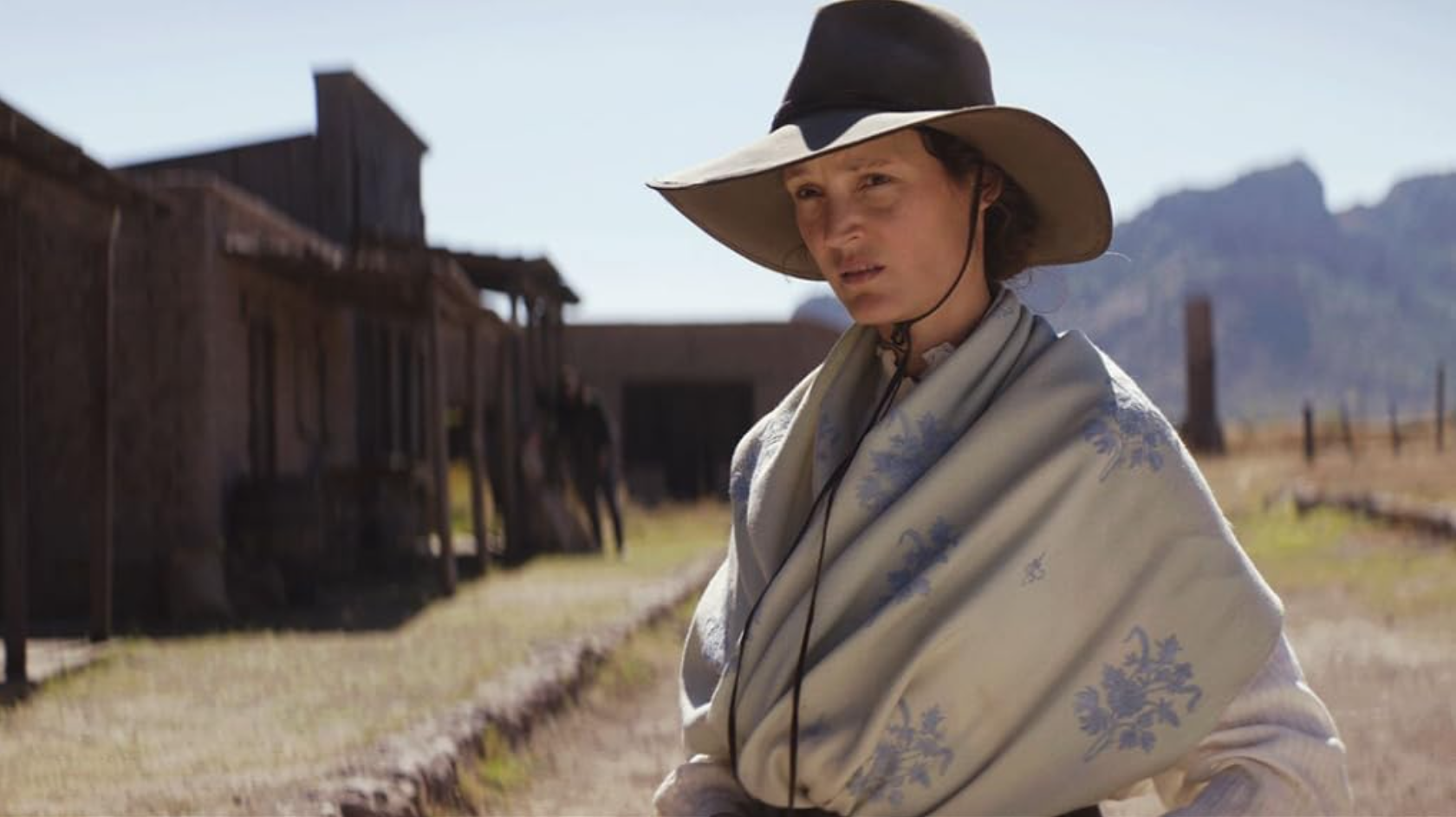 In one sense, the story is quite traditional, but this film, written and directed by Mortensen, is unique and particular in all the ways that really matter. Vivienne is a stronger character than Olsen (and Krieps is billed above Mortensen), and the film is justified in making her its center — despite her dying in the first scene. We see her as a child in the eastern Canadian forests, being read to from the Joan book; decades later in the remote Nevada cabin, she reads the same book to her own son. She brightens the cabin and plants trees and flowers around it less to add “a woman’s touch” or a “civilizing” influence and more because her self-respect demands it; Olsen might be all right with “living like a dog,” as she puts it — “Well, a happy dog,” he admits, not much bothered — but she isn’t. Indeed, she’s quite self-sufficient, and doesn’t let anyone underestimate her. When Weston, trying to act nice, brings her two bundles of manure for her garden, he offers to send a workman to spread it. “I can do it myself,” she replies, and not even he doubts her.