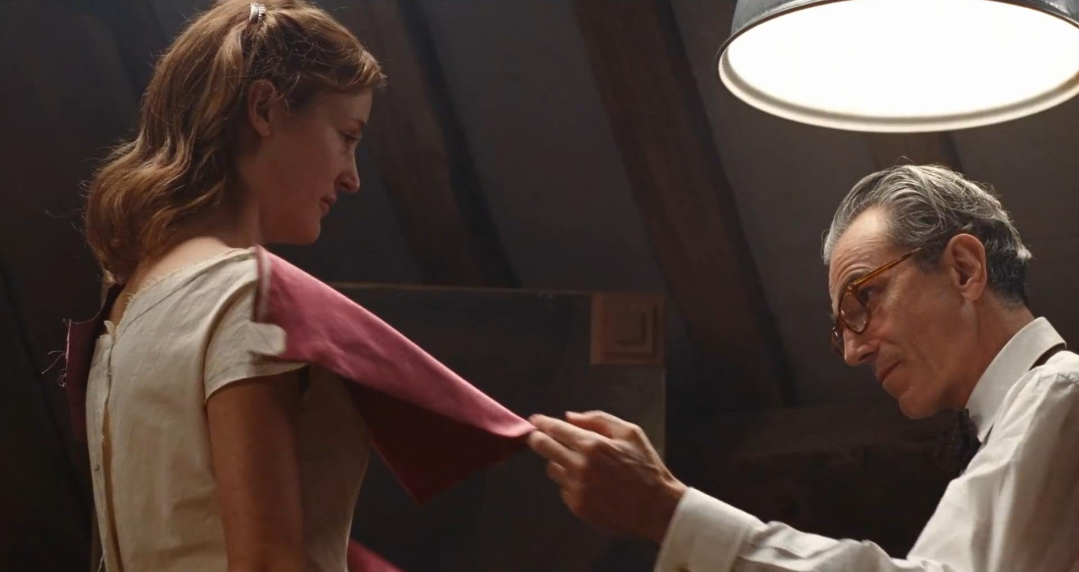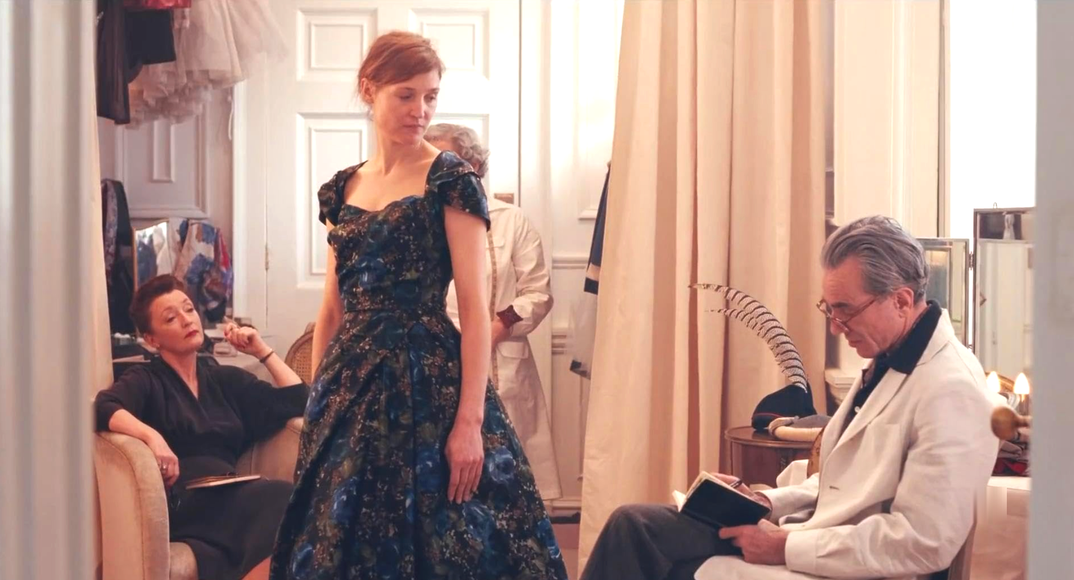 Reynolds (Daniel Day-Lewis) asks Alma why she is acting grumpy. She replies that the dress doesn’t feel right; it’s the fabric — which to this viewer’s untrained eye did look heavy, somewhat brocade-like, and unflattering.